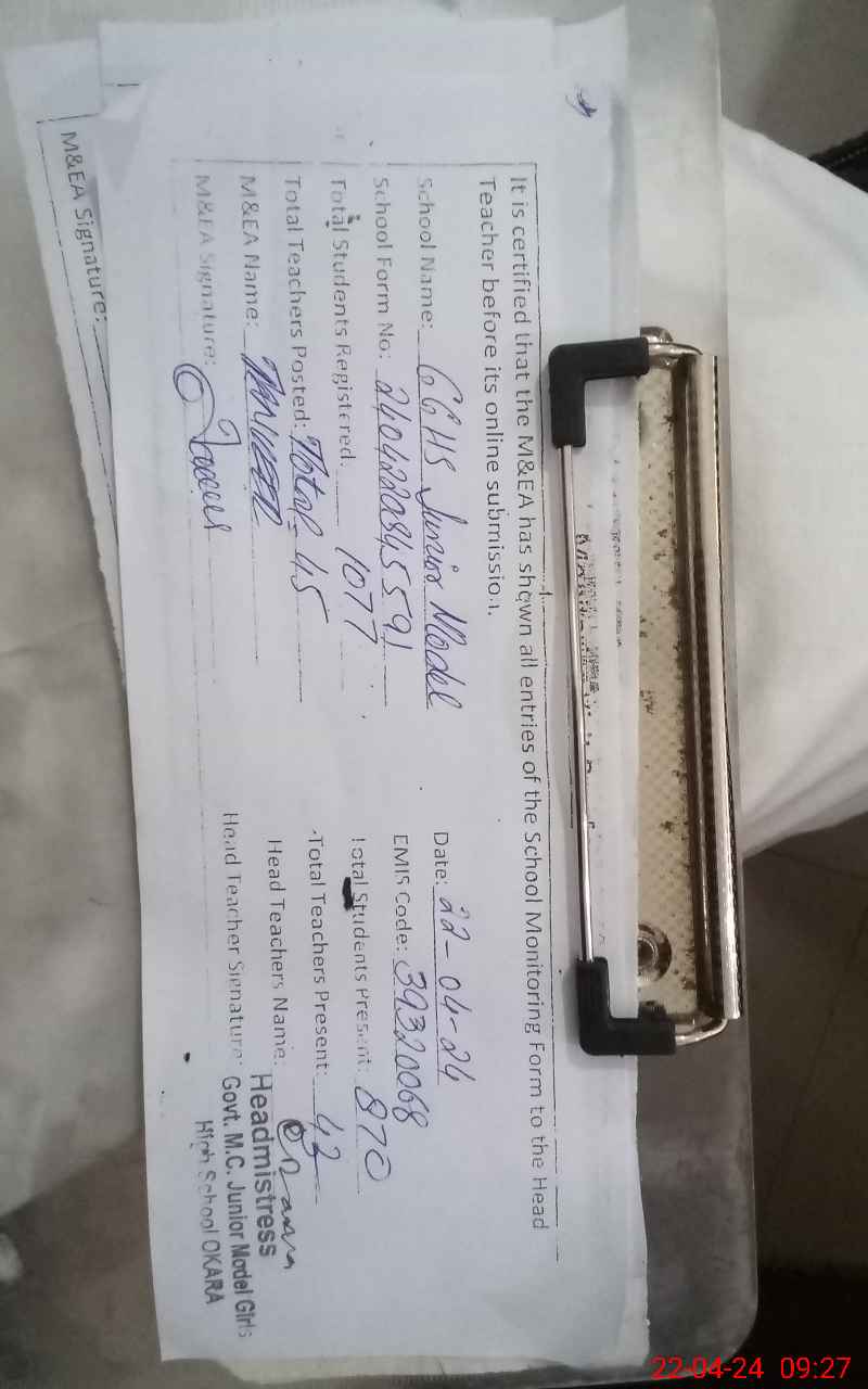 | EMIS Code: 39320068 | Name of School: GGHS MC JUNIOR MODEL OKARA | |||