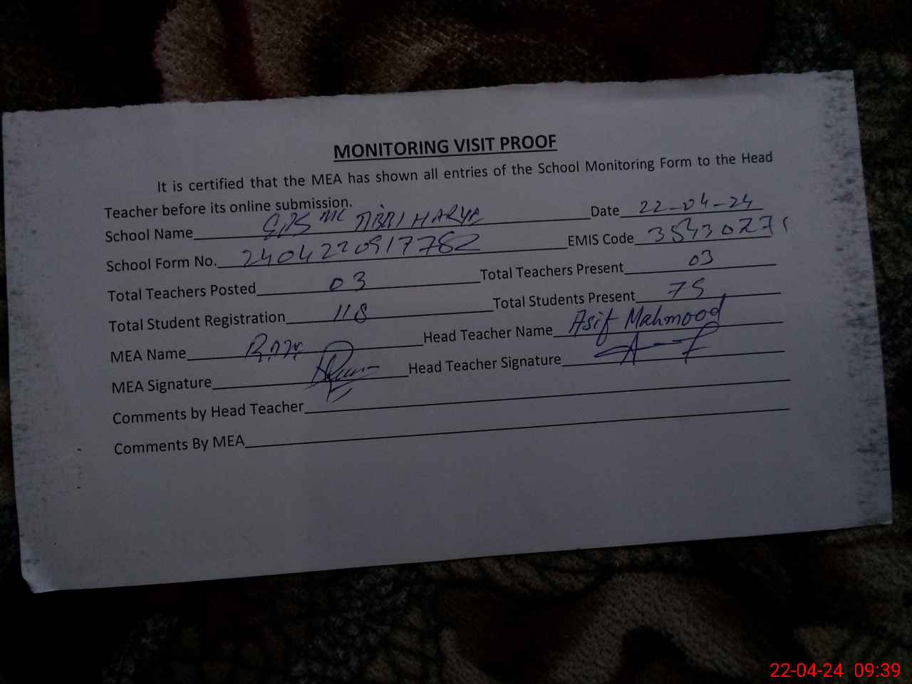 | Attendance Register | Head Teacher | MEA with School | Visit Proof |