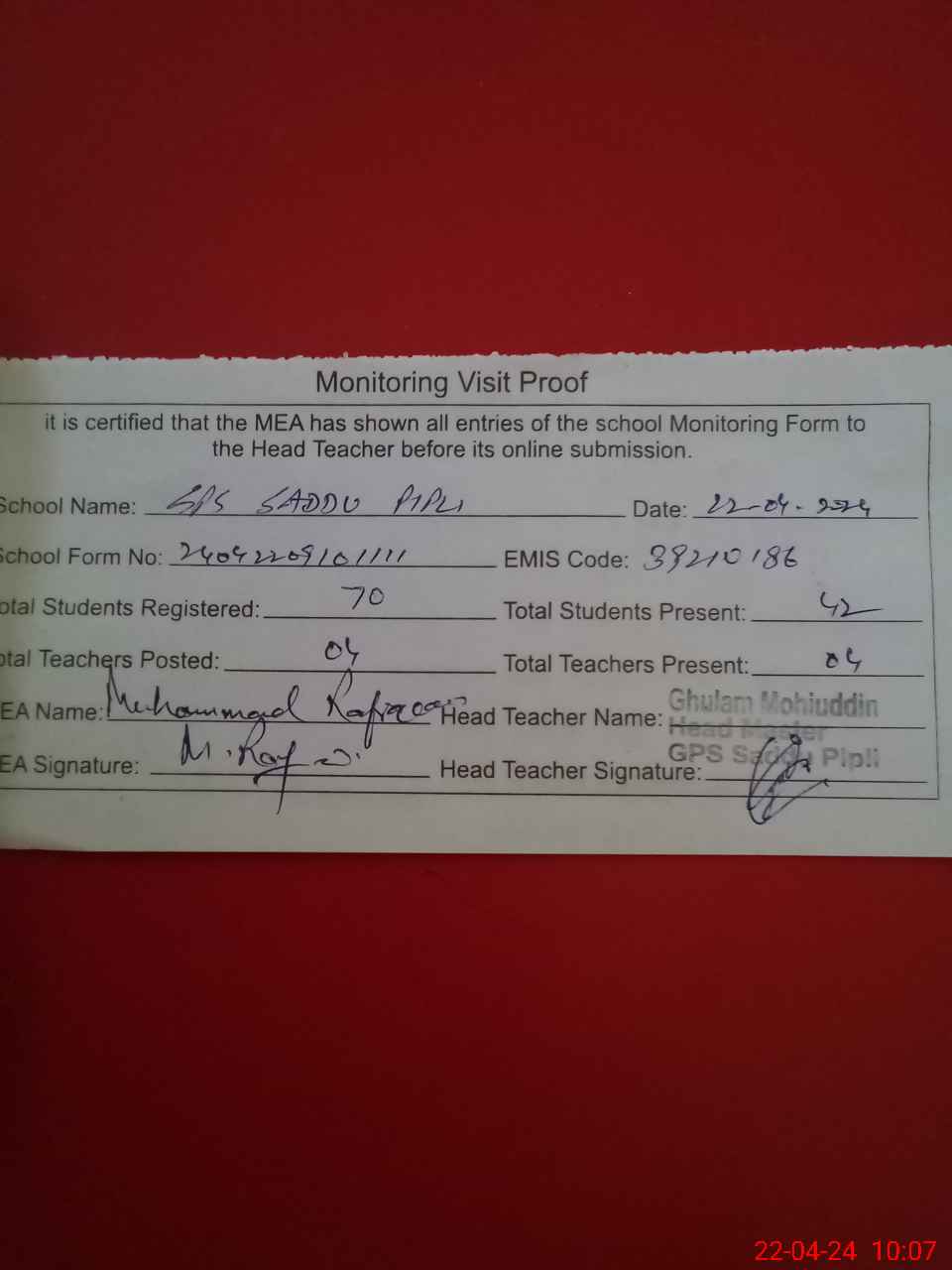 | Attendance Register | Head Teacher | MEA with School | Visit Proof |