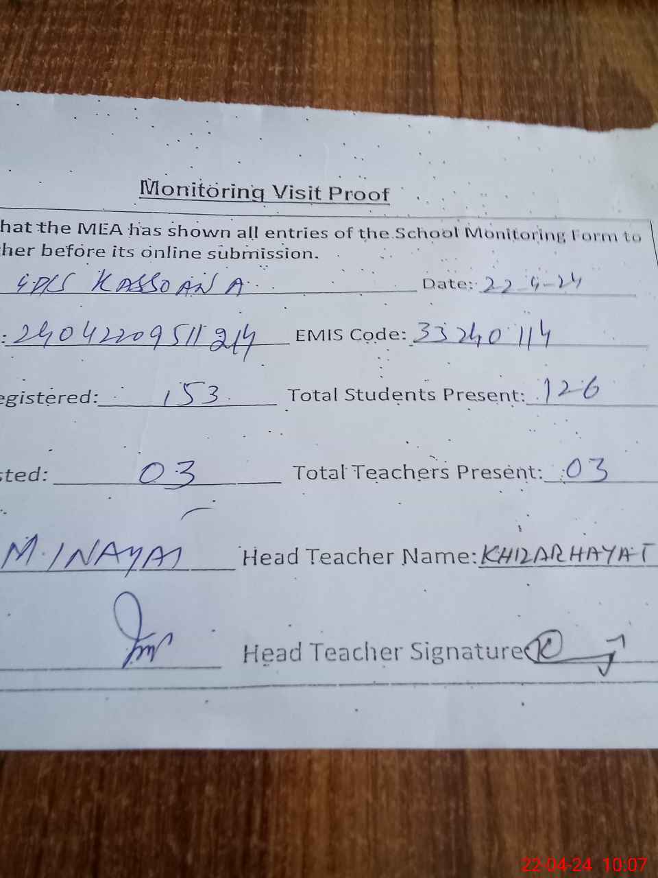 | Attendance Register | Head Teacher | MEA with School | Visit Proof |