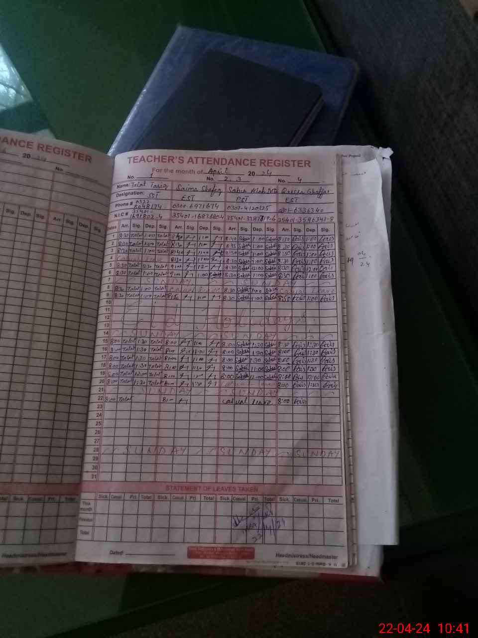 | CNIC | Full Name | Designation | R/C | Absence During Last Calender Month |
