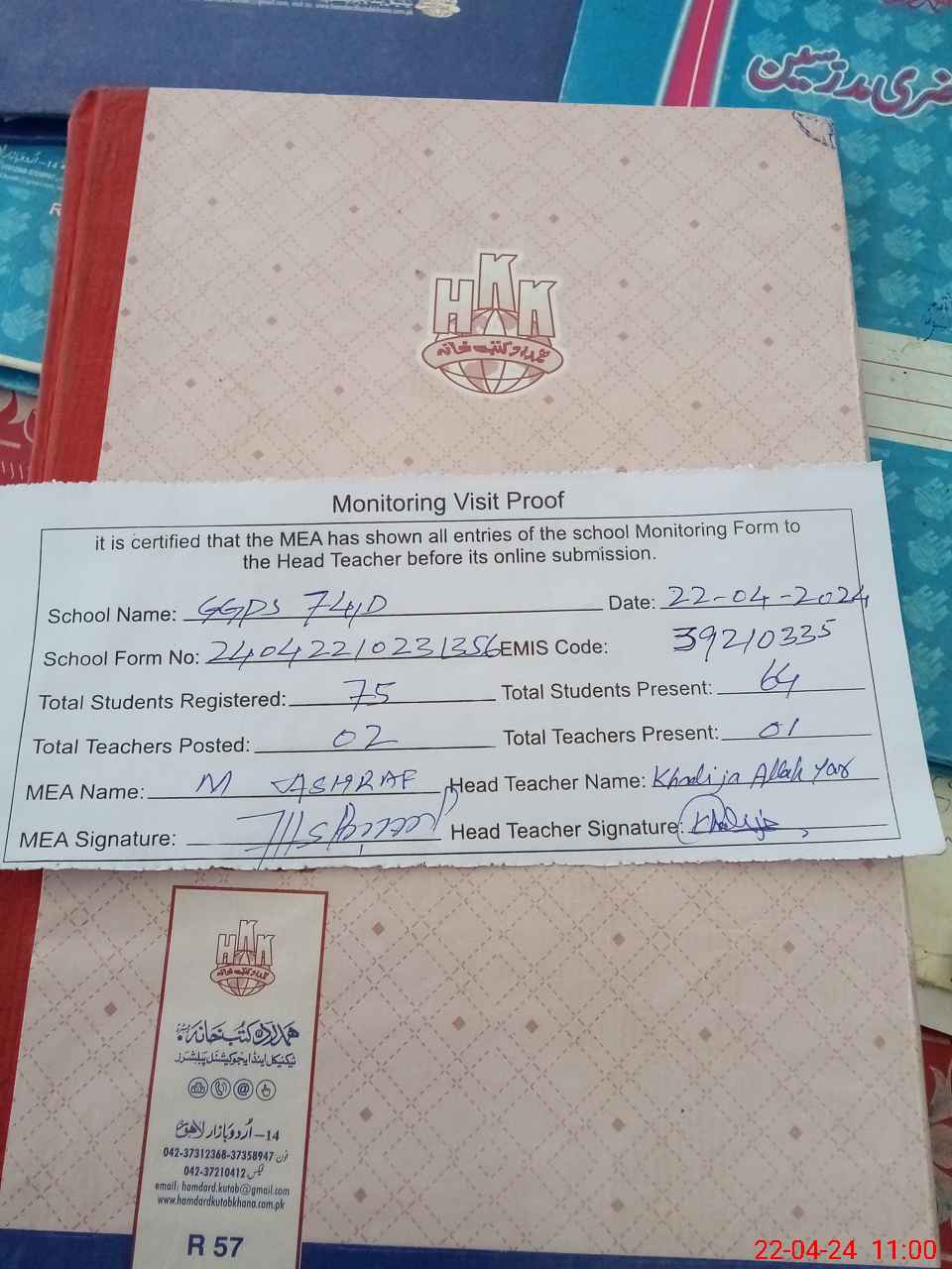 | Attendance Register | Head Teacher | MEA with School | Visit Proof |