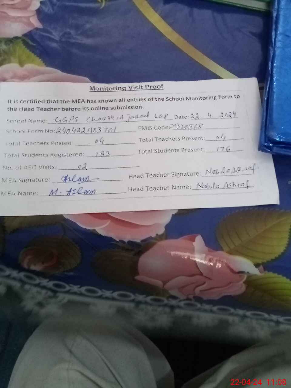 | EMIS Code: 31320568 | Name of School: GGPS CHAK 44/A JADEED | |||