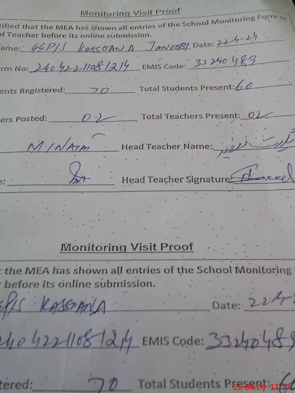| Name: NI**** SA**** Designation: (School Headmaster's/Headmistress's) PST Phone/Cell Number: 03**** |