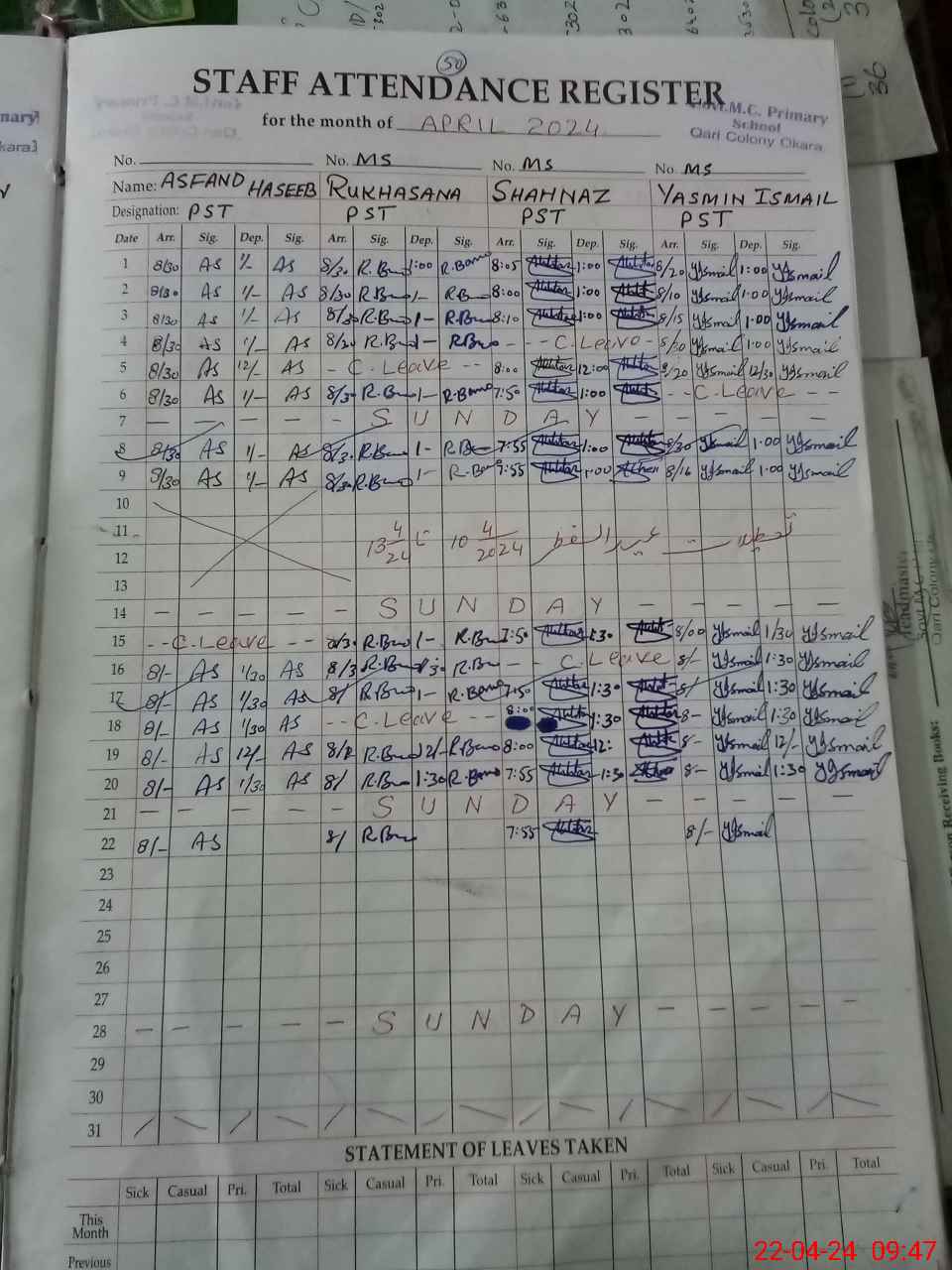 | Leave | Duty | Absent | Maternity | Medical | Ex- Pak |