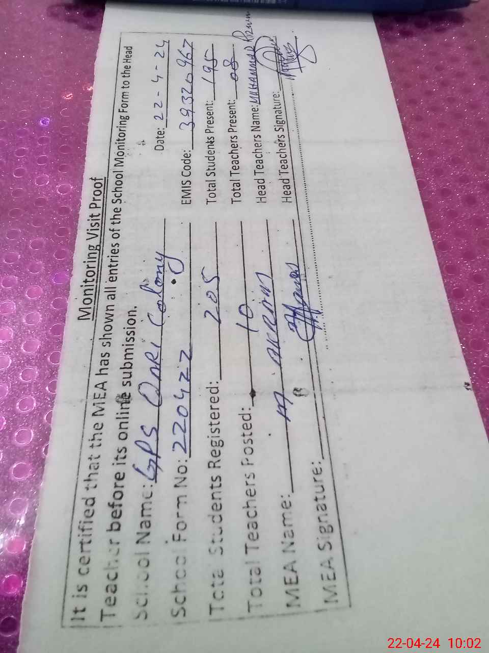 | Certified that this School was Inspected by the Undersigned MEA/DMO Today and the Information Stated Above is as Per Record. | |||||