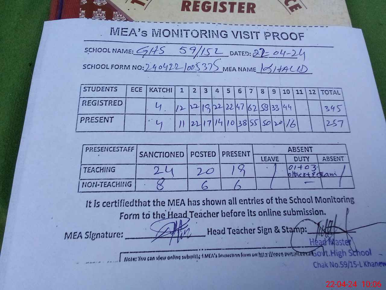 | EMIS Code: 36430017 | Name of School: GHS 59/15-L, MIAN CHANNU | |||