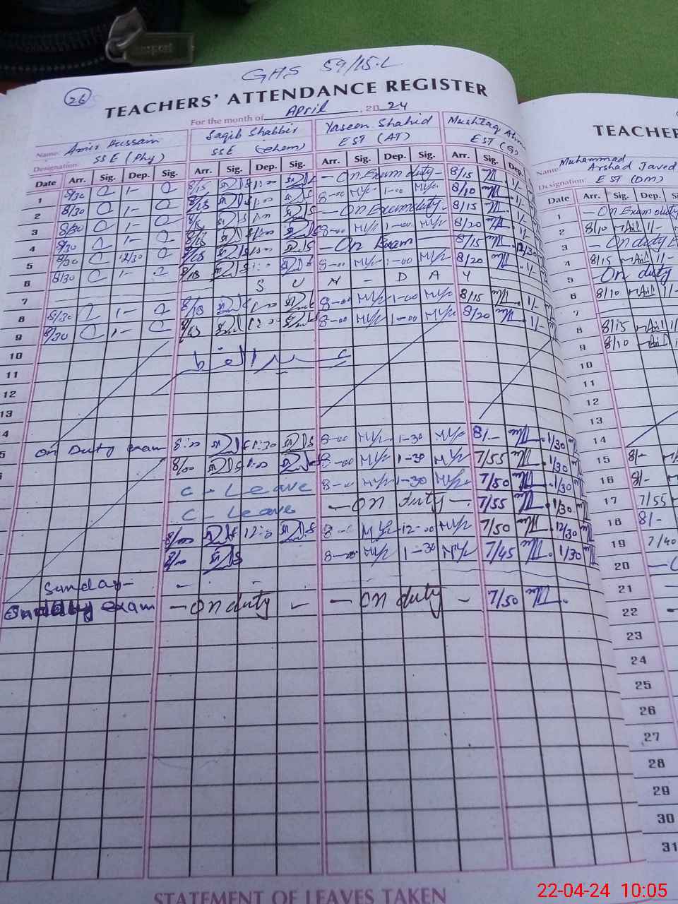 | 36**** | Mu**** Ar**** Ja**** | 1 | 0 | 17 | 0 | 0 | 0 | 0 | 0 | 0 | 0 | Exam Duty | |