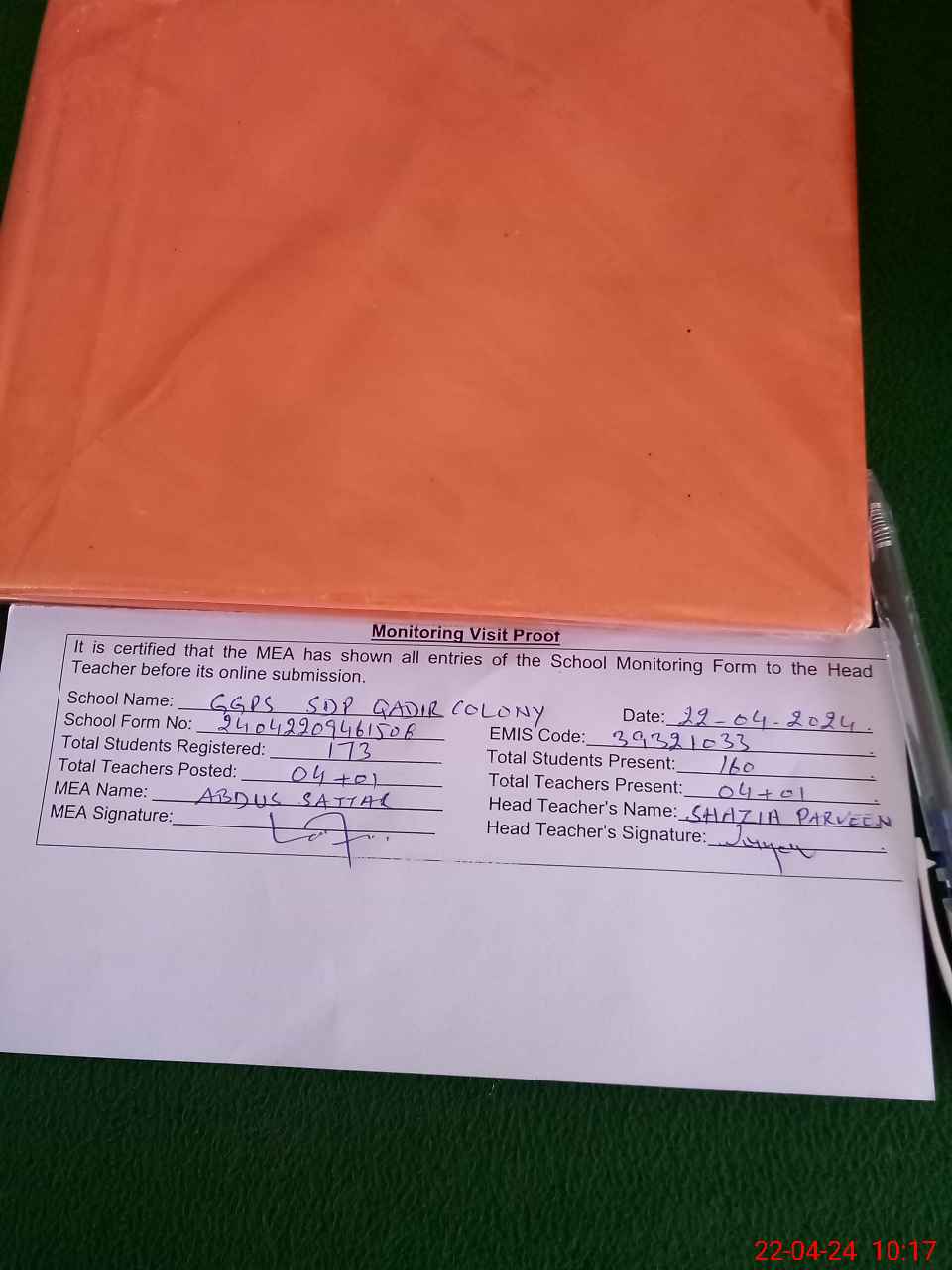 | Attendance Register | Head Teacher | MEA with School | Visit Proof |