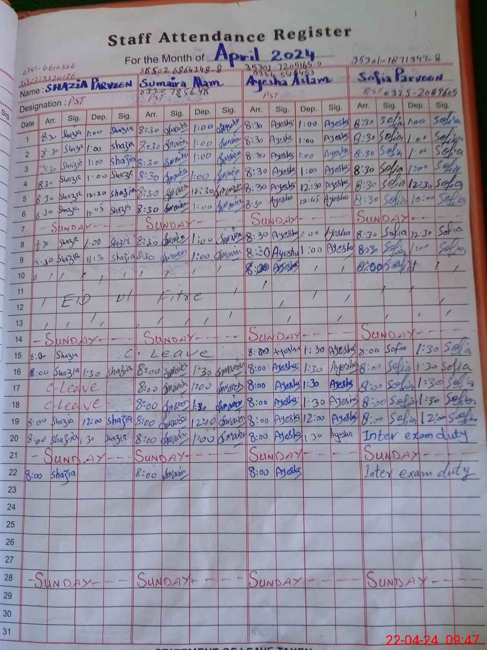 | CNIC | Full Name | Designation | R/C | Absence During Last Calender Month |