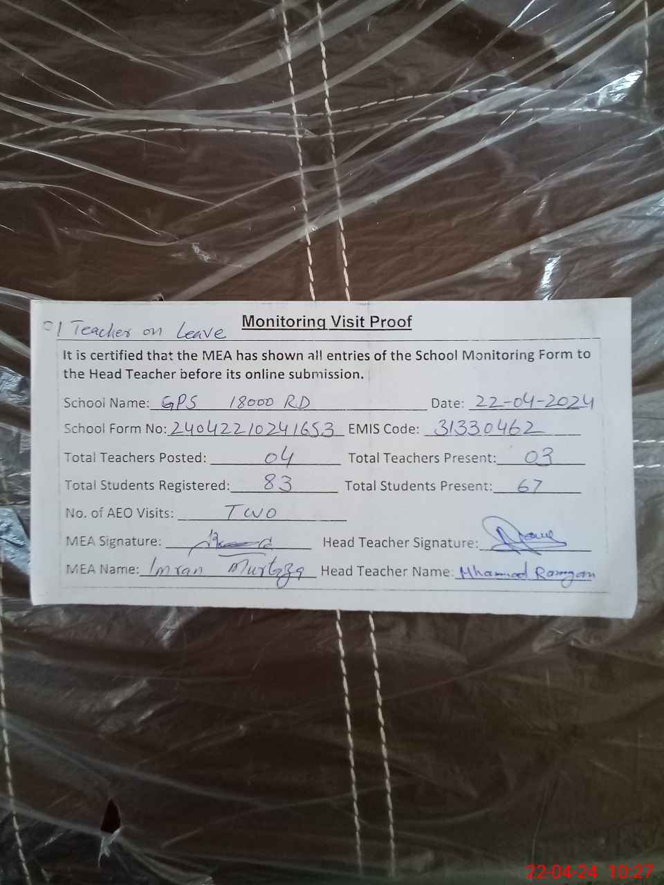 | EMIS Code: 31330462 | Name of School: GPS CHAK NO.18000/RD | |||