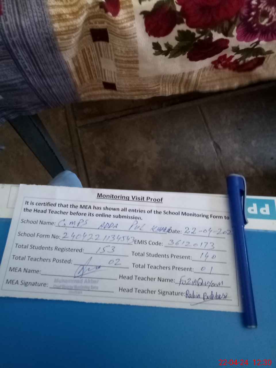 | Attendance Register | Head Teacher | MEA with School | Visit Proof |