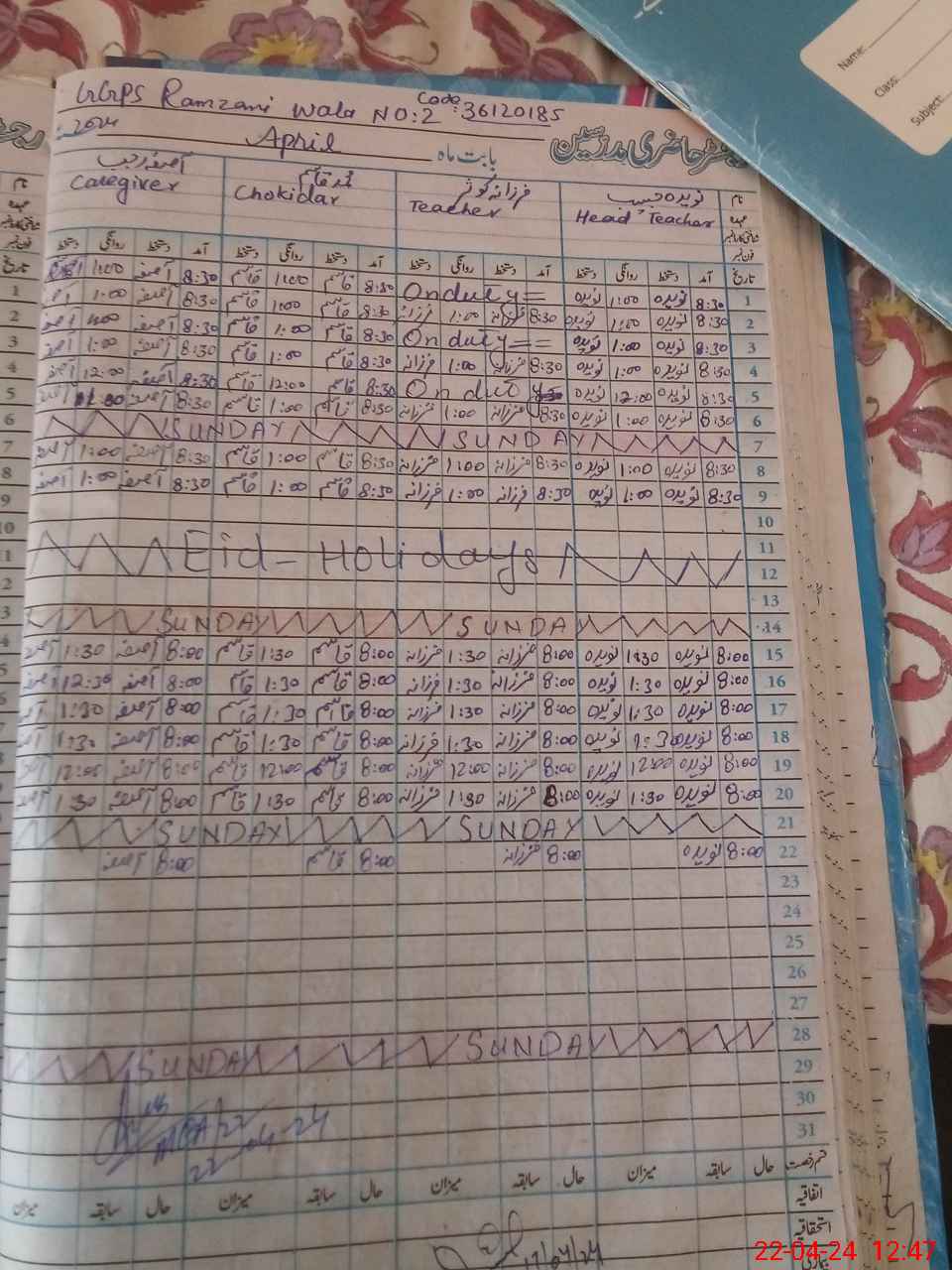 | CNIC | Full Name | Designation | R/C | Absence During Last Calender Month |