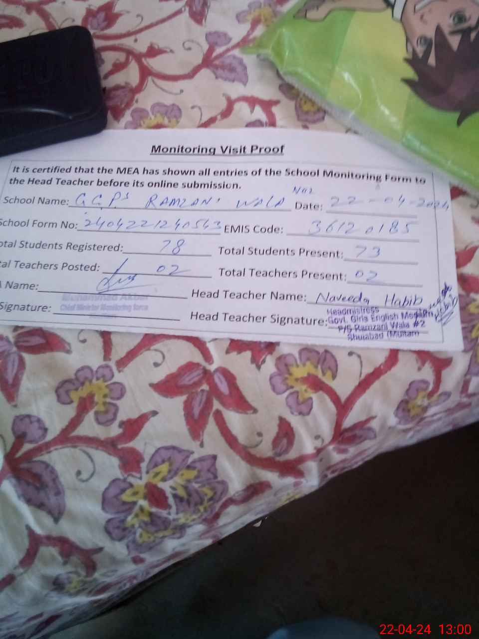 | Attendance Register | Head Teacher | MEA with School | Visit Proof |