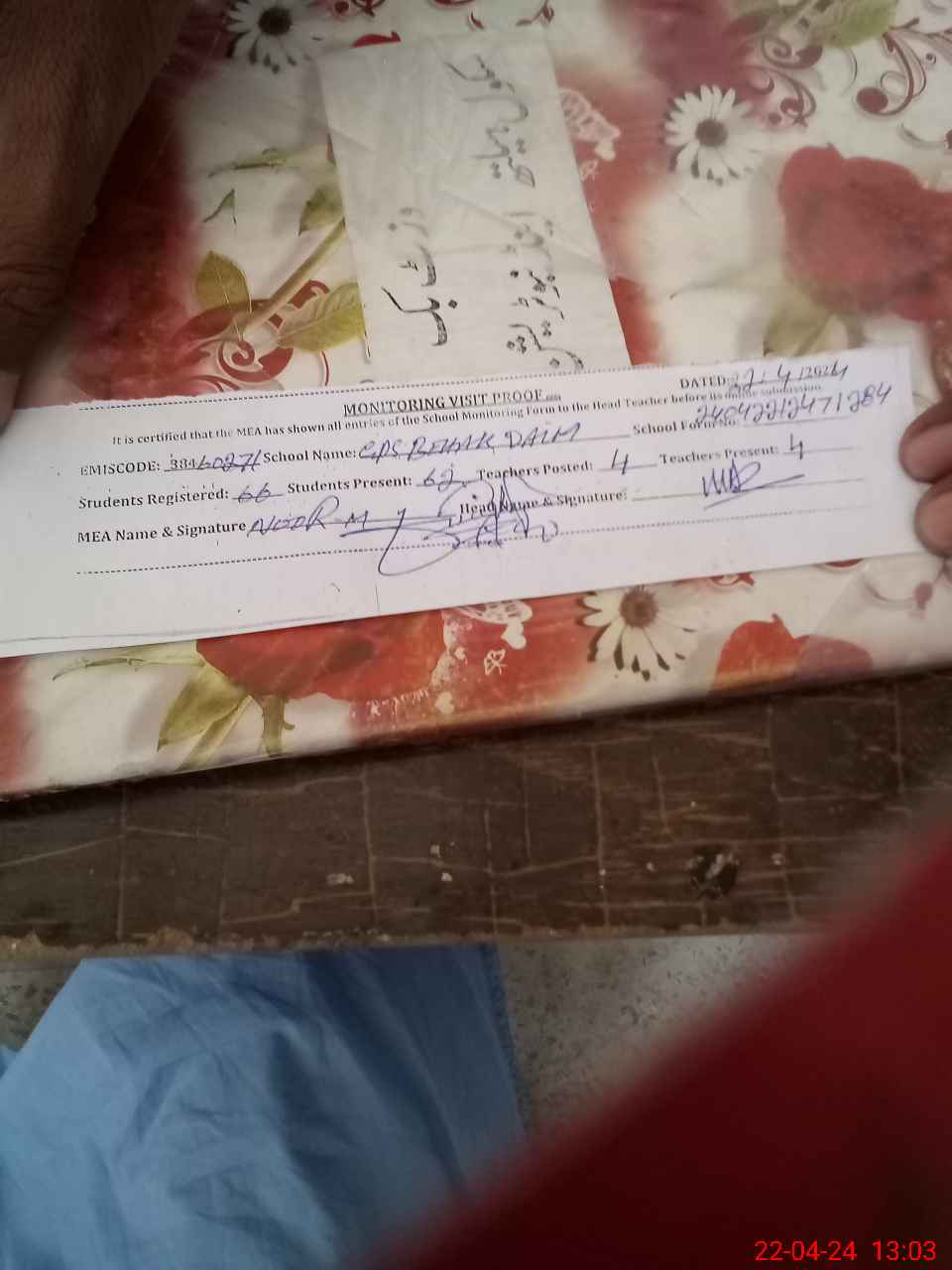 | Attendance Register | Head Teacher | MEA with School | Visit Proof |