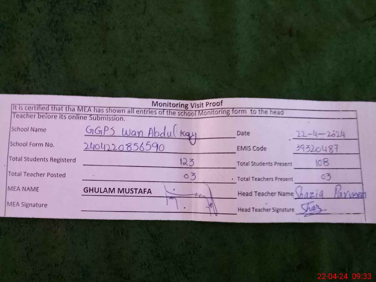 | Attendance Register | Head Teacher | MEA with School | Visit Proof |