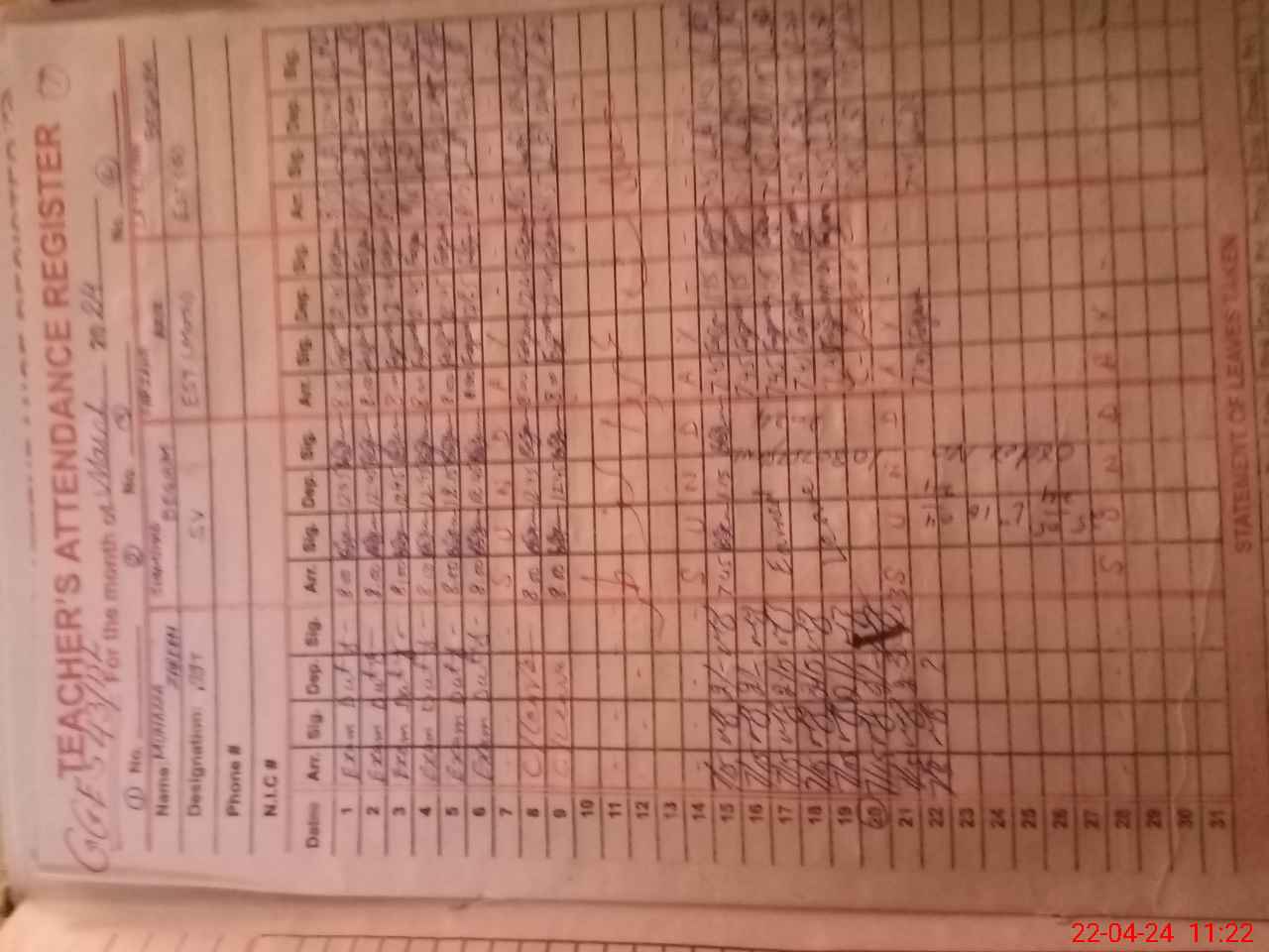 | CNIC | Full Name | Designation | R/C | Absence During Last Calender Month |
