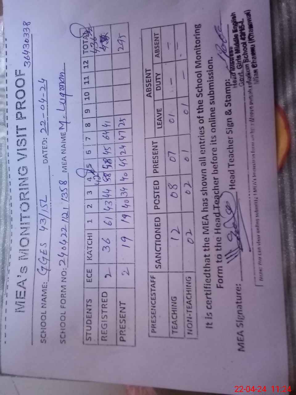 | Attendance Register | Head Teacher | MEA with School | Visit Proof |
