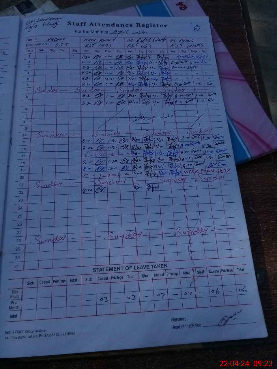| CNIC | Full Name | Designation | R/C | Absence During Last Calender Month |