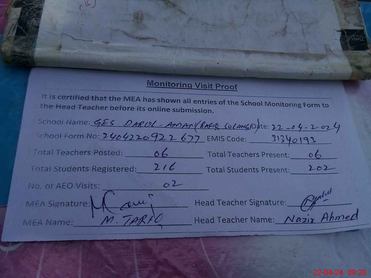 | Attendance Register | Head Teacher | MEA with School | Visit Proof |