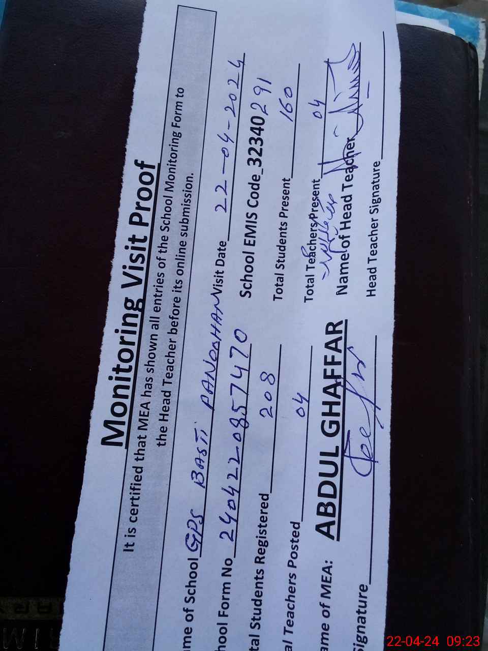 | Attendance Register | Head Teacher | MEA with School | Visit Proof |