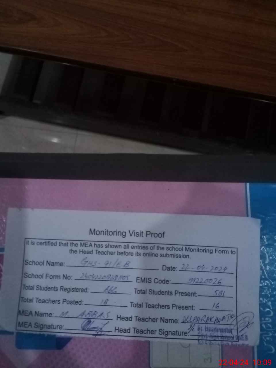 | Certified that this School was Inspected by the Undersigned MEA/DMO Today and the Information Stated Above is as Per Record. | |||||
