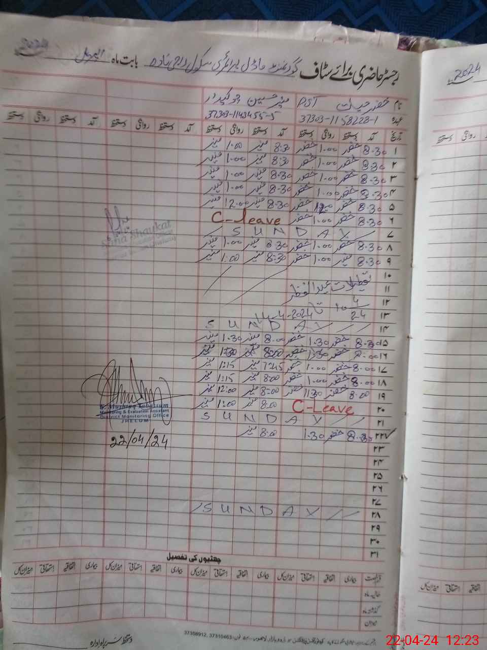 | CNIC | Full Name | Designation | R/C | Absence During Last Calender Month |