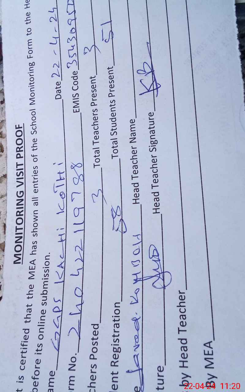 | Attendance Register | Head Teacher | MEA with School | Visit Proof |