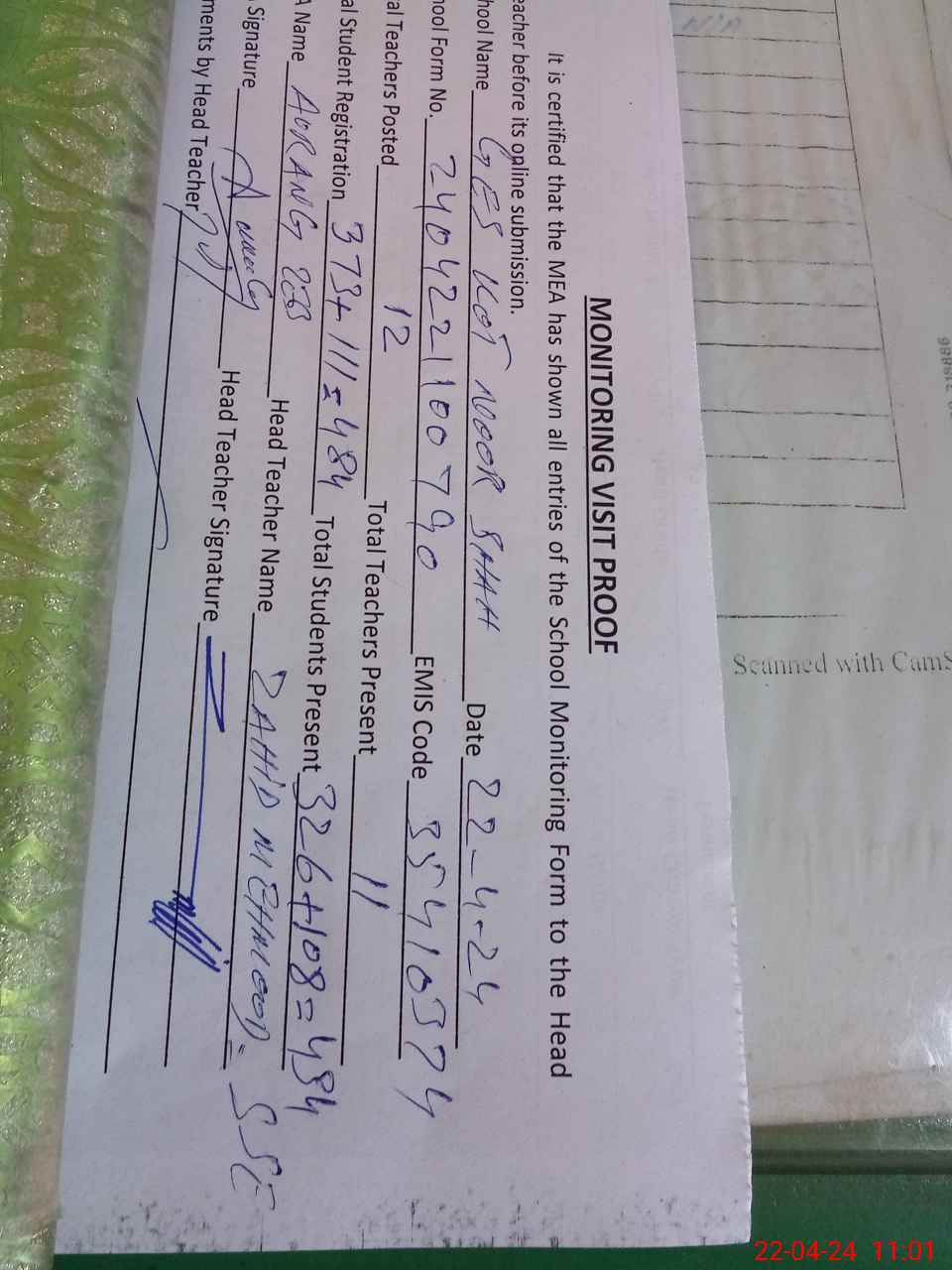 | Name: Za**** Me**** Designation: (School Headmaster's/Headmistress's) SSe Phone/Cell Number: 03**** |