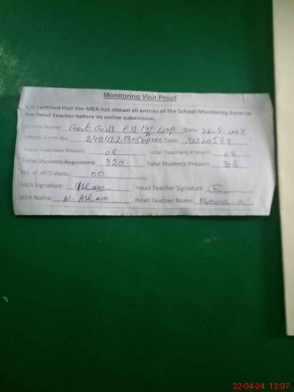 | Certified that this School was Inspected by the Undersigned MEA/DMO Today and the Information Stated Above is as Per Record. | |||||