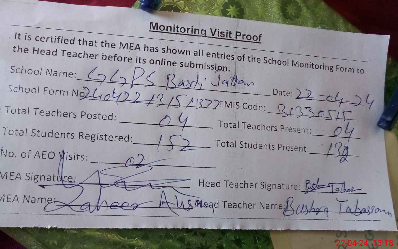 | Monitoring Date: 22-04-2024 | Start Time: 22-04-2024 12:37 PM | End Time: 22-04-2024 01:21 PM | Name of MEA: Za**** Ah**** | |