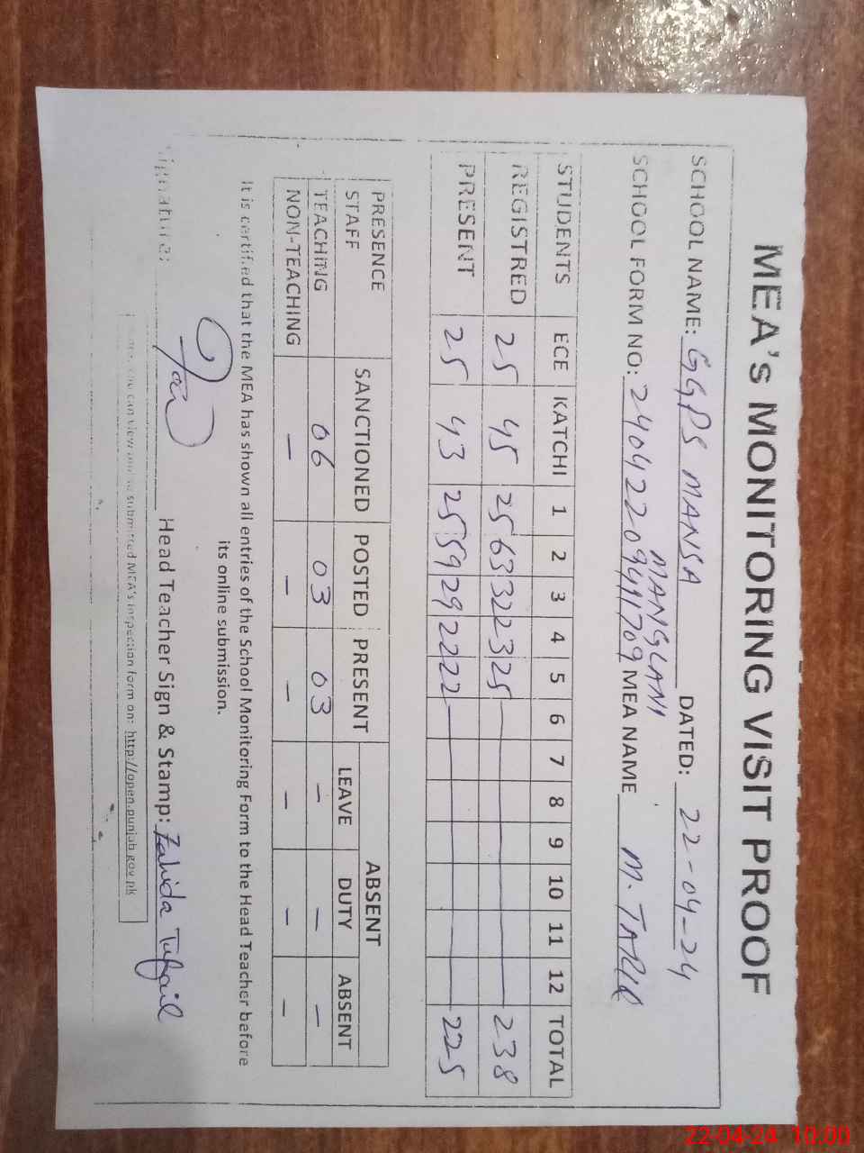 | Attendance Register | Head Teacher | MEA with School | Visit Proof |
