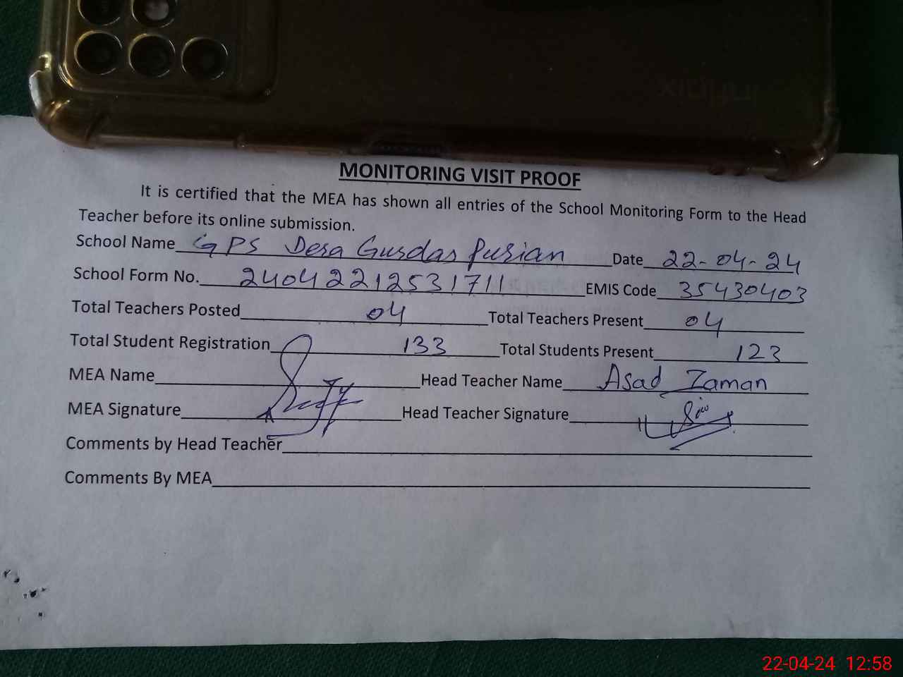 | Name: AS**** ZA**** Designation: (School Headmaster's/Headmistress's) PST Phone/Cell Number: 03**** |