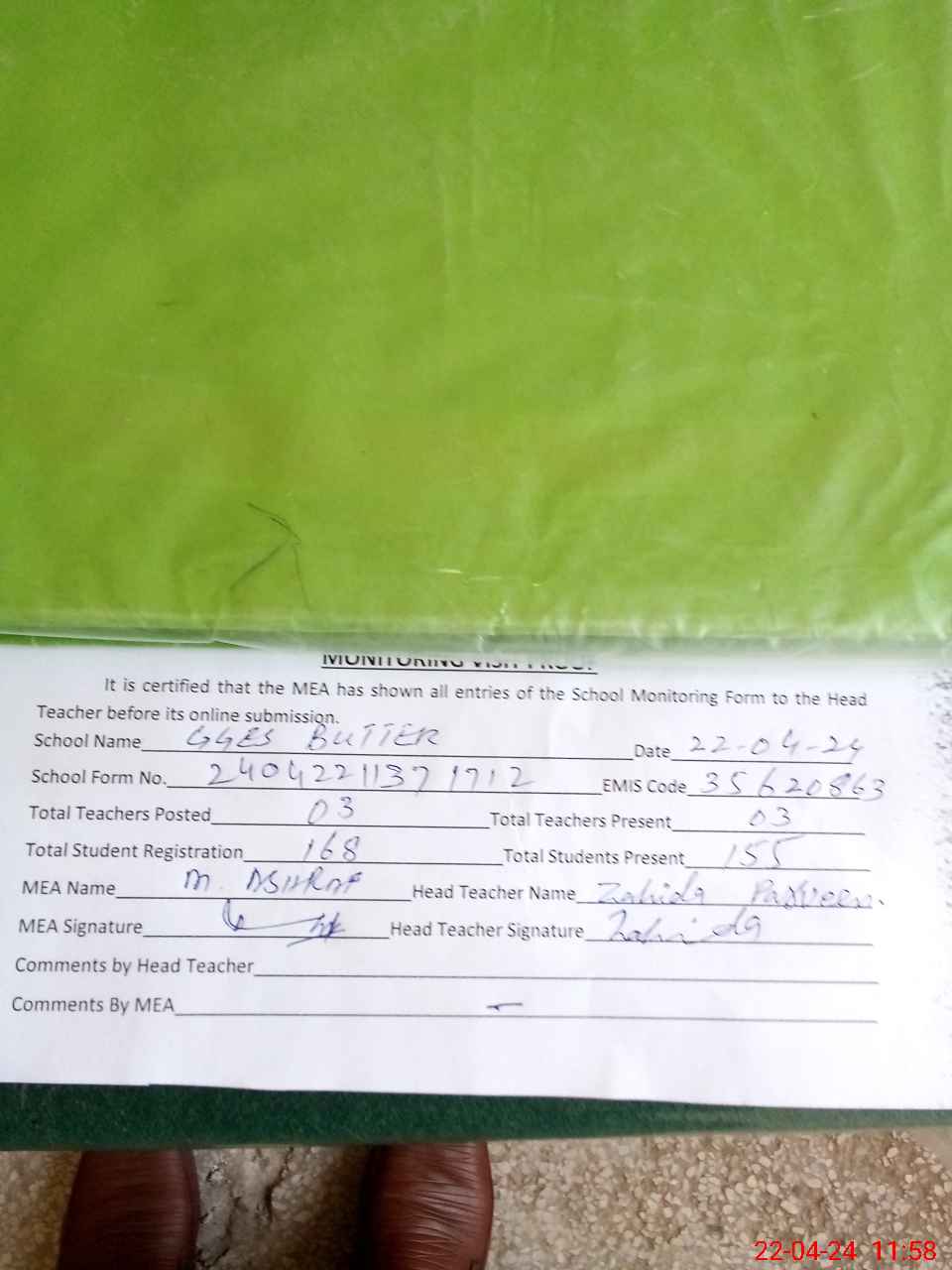 | Attendance Register | Head Teacher | MEA with School | Visit Proof |