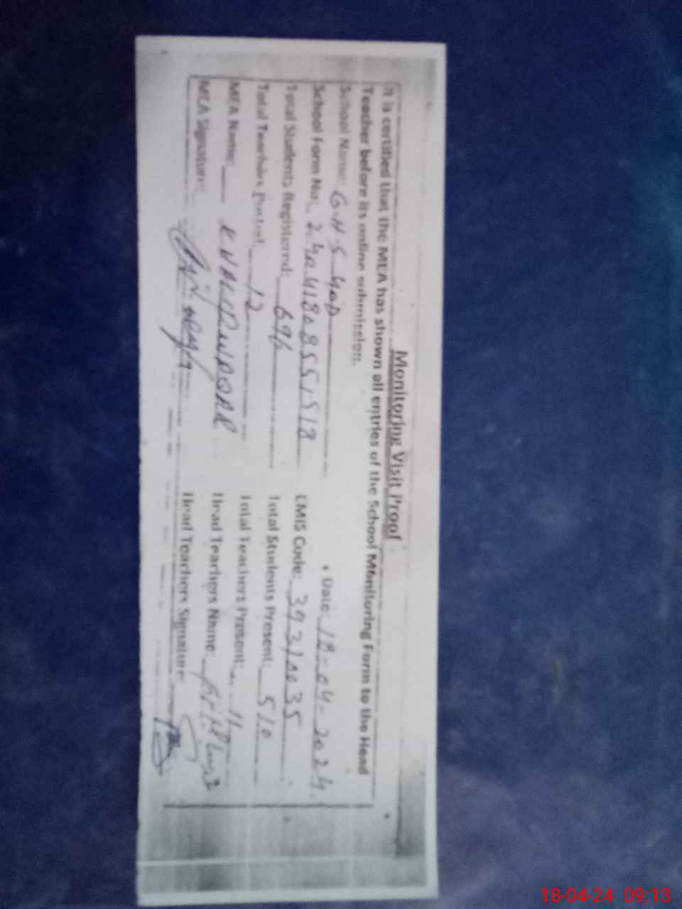 | Attendance Register | Head Teacher | MEA with School | Visit Proof |