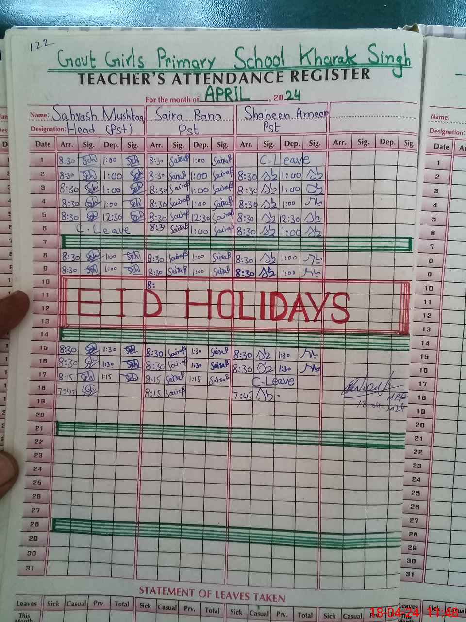 | Leave | Duty | Absent | Maternity | Medical | Ex- Pak |
