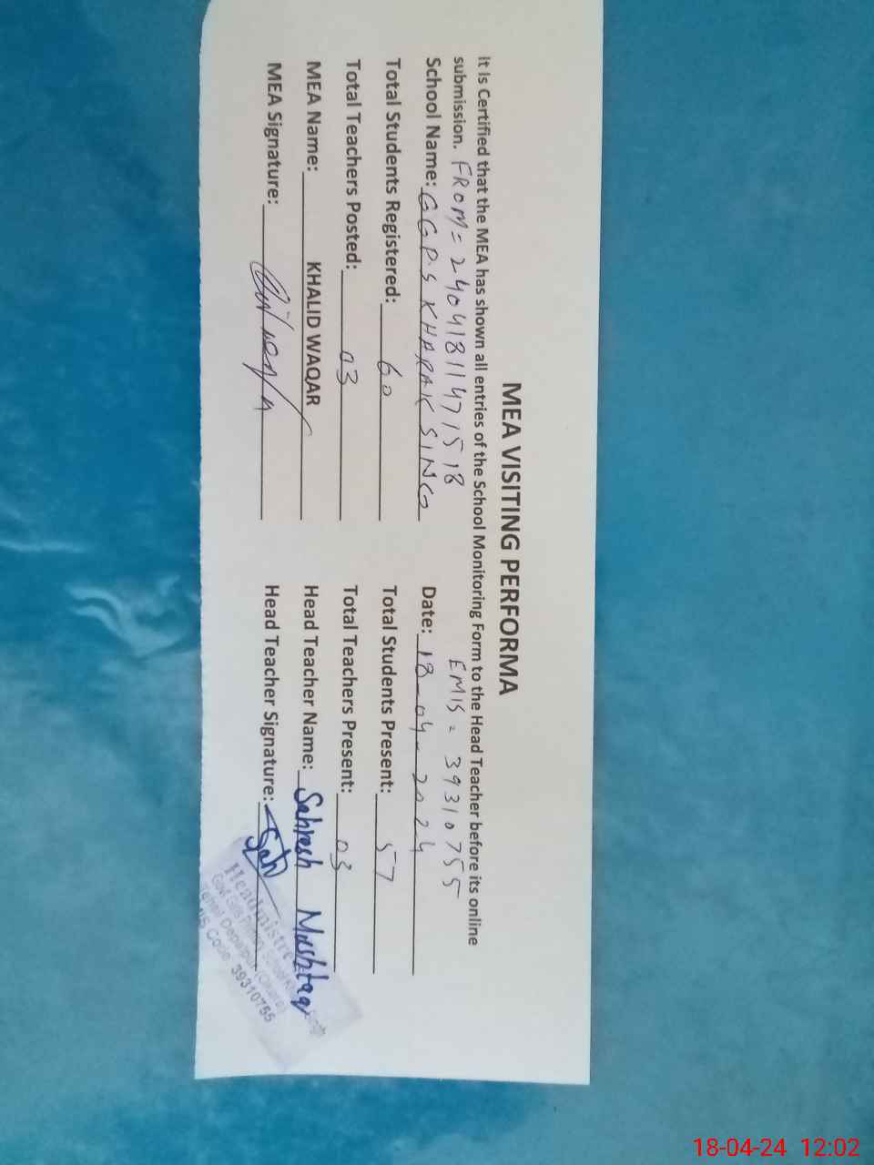 | Attendance Register | Head Teacher | MEA with School | Visit Proof |