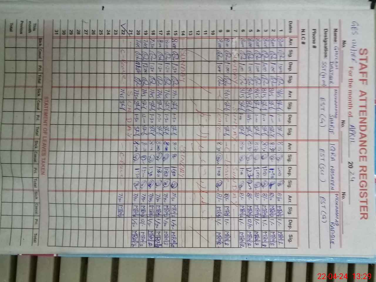 | CNIC | Full Name | Designation | R/C | Absence During Last Calender Month |