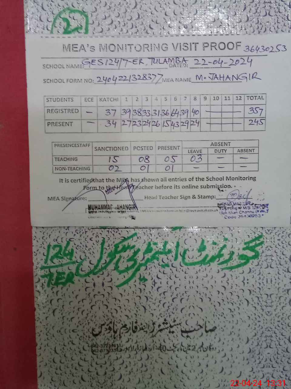 | Attendance Register | Head Teacher | MEA with School | Visit Proof |