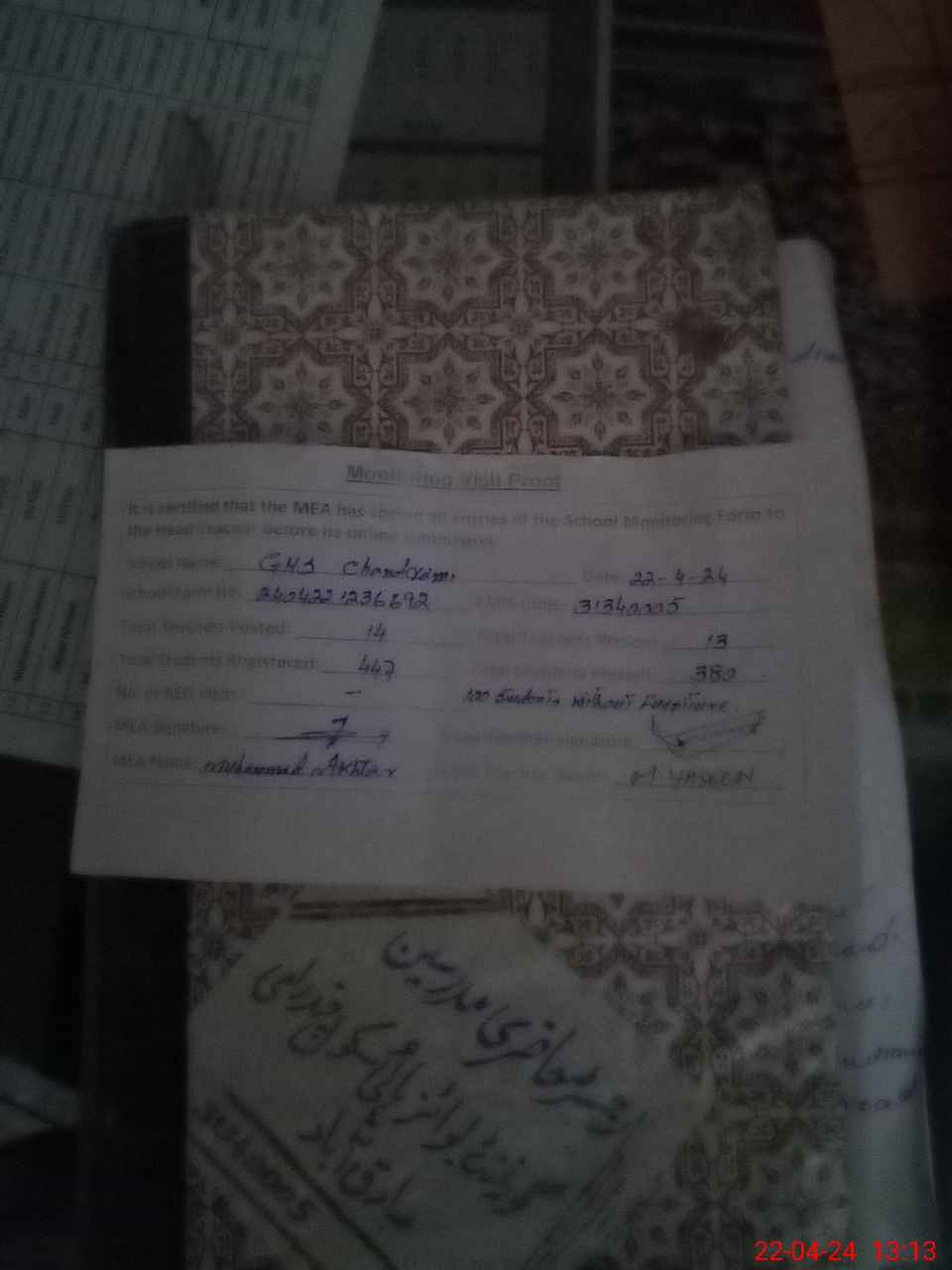 | Attendance Register | Head Teacher | MEA with School | Visit Proof |