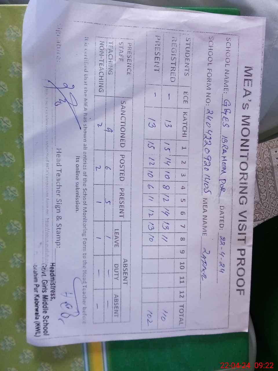 | Attendance Register | Head Teacher | MEA with School | Visit Proof |