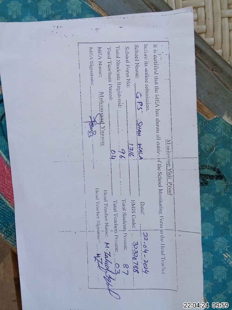| EMIS Code: 32320788 | Name of School: GPS SHAH WALA | |||