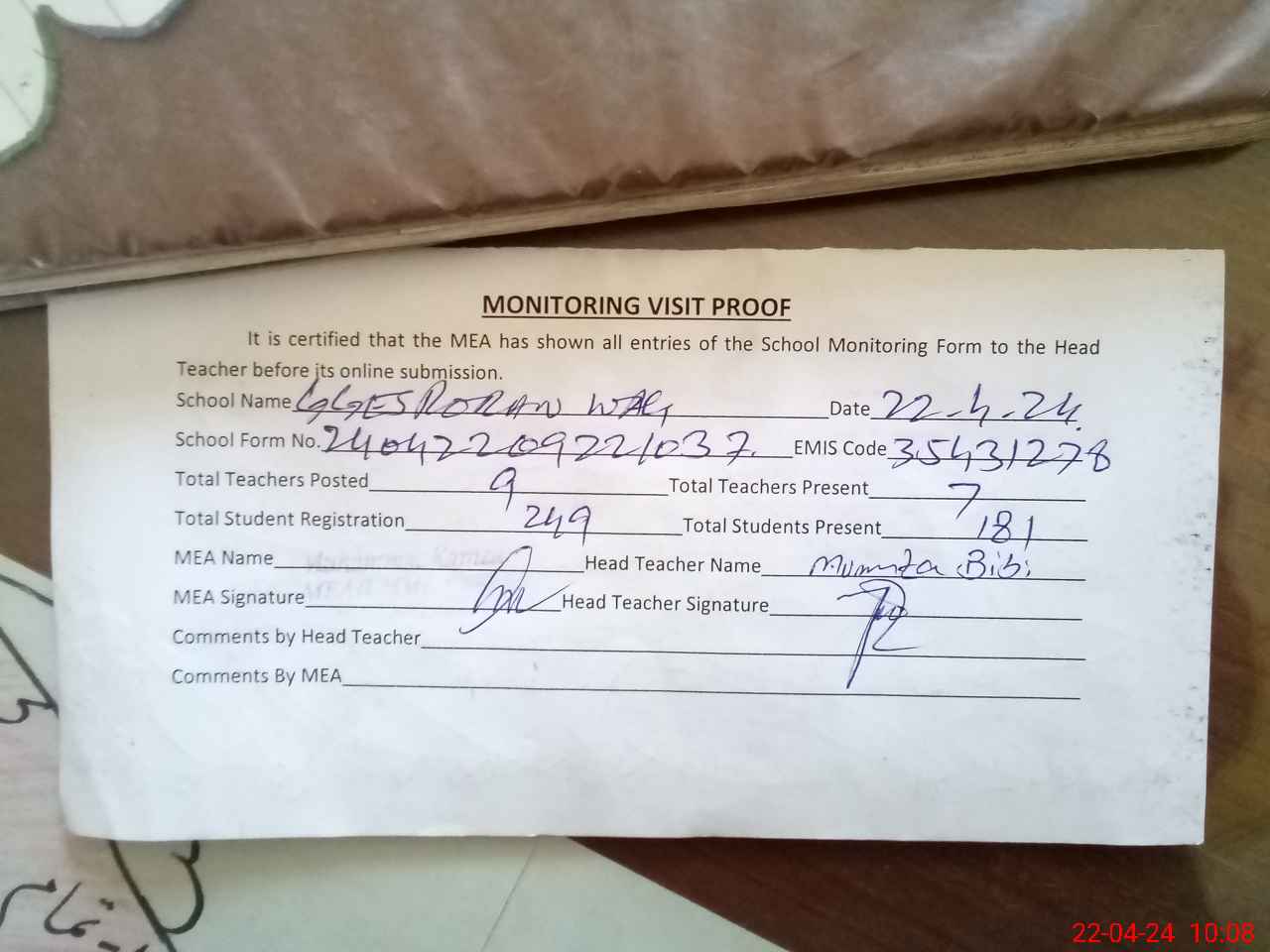 | Attendance Register | Head Teacher | MEA with School | Visit Proof |