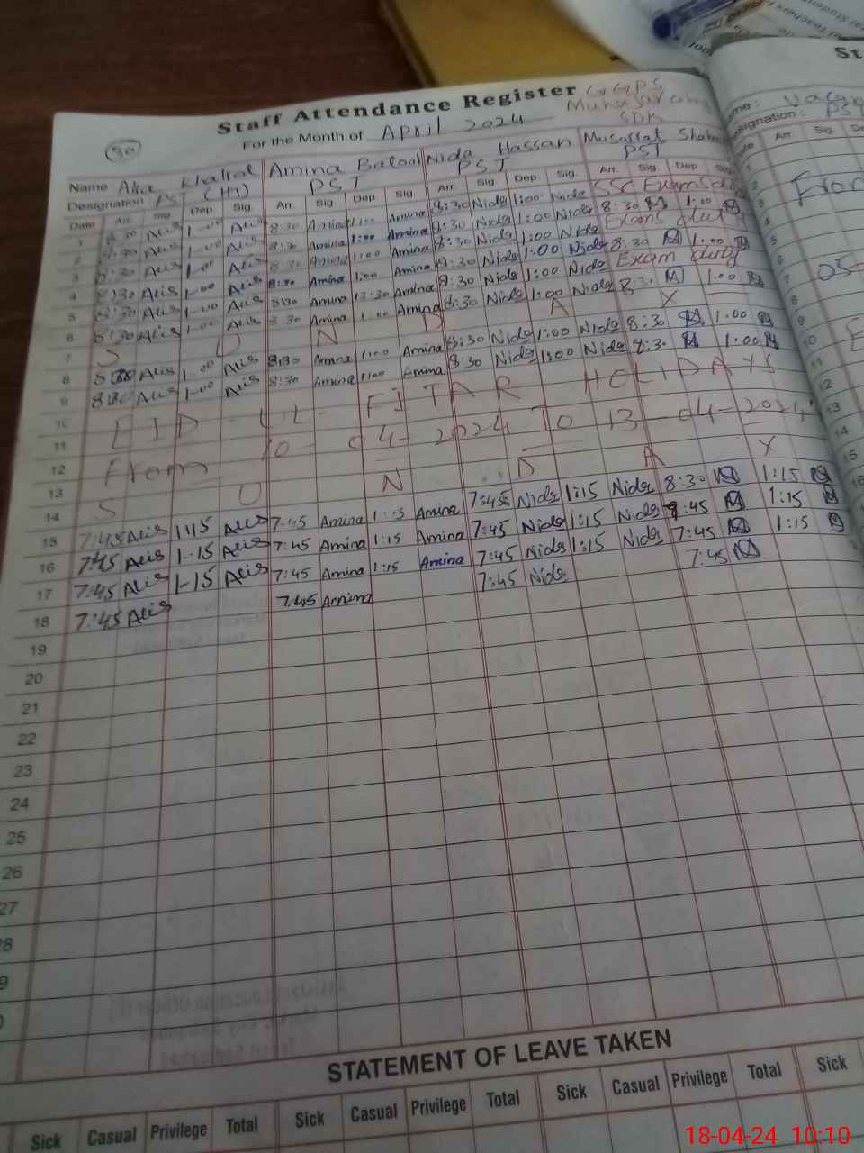 | Leave | Duty | Absent | Maternity | Medical | Ex- Pak |