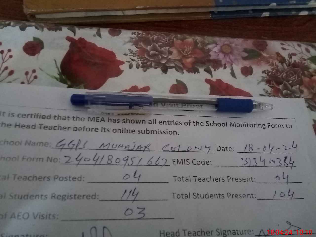 | Attendance Register | Head Teacher | MEA with School | Visit Proof |