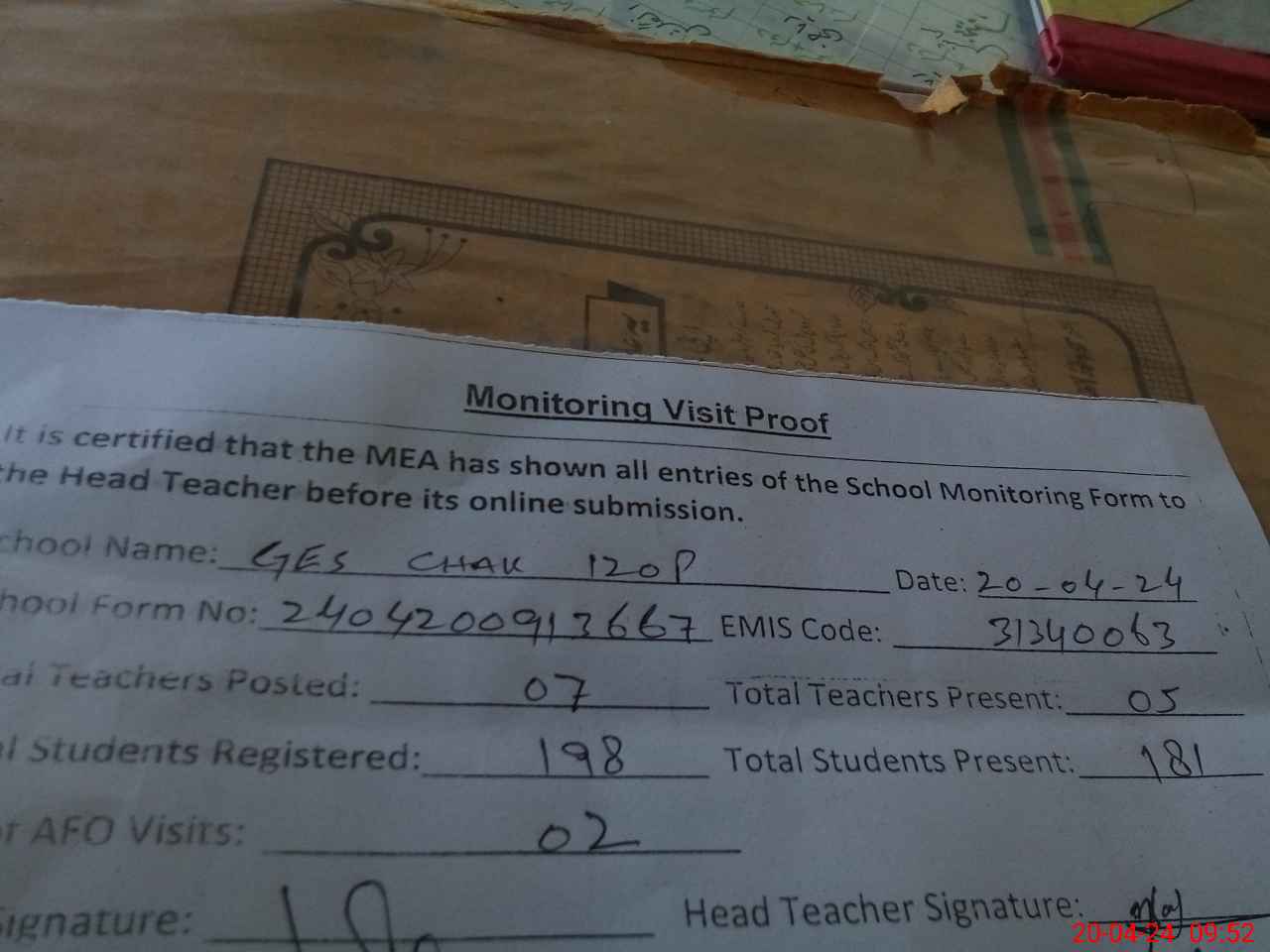 | Attendance Register | Head Teacher | MEA with School | Visit Proof |