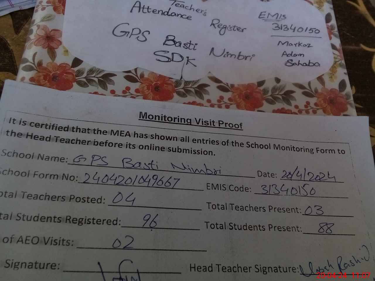 | Attendance Register | Head Teacher | MEA with School | Visit Proof |