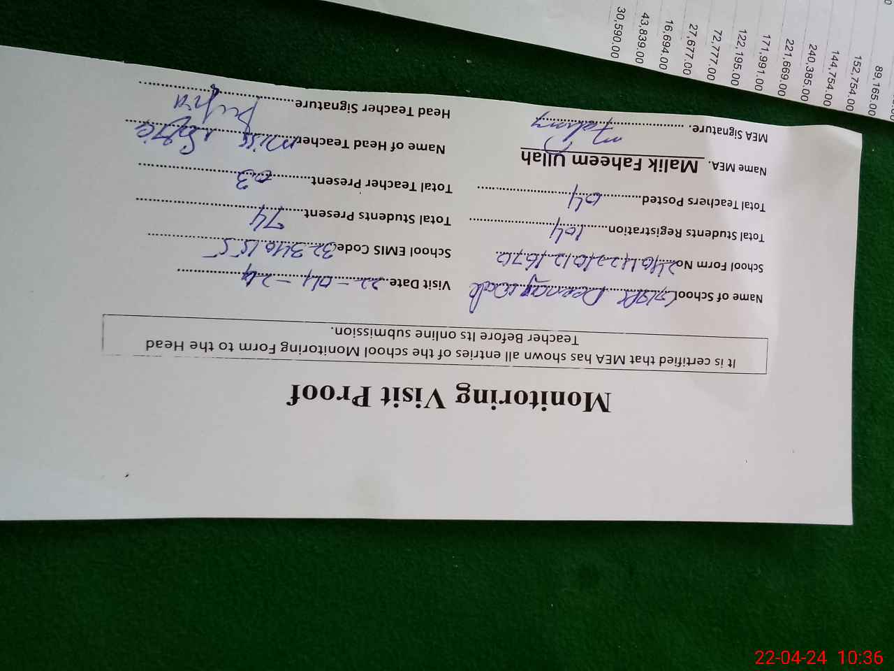 | Attendance Register | Head Teacher | MEA with School | Visit Proof |