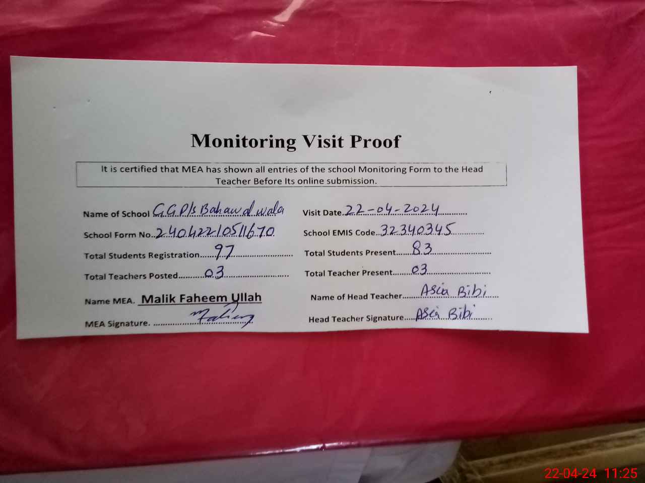 | EMIS Code: 32340345 | Name of School: GGPS BAHAWAL WALA | |||