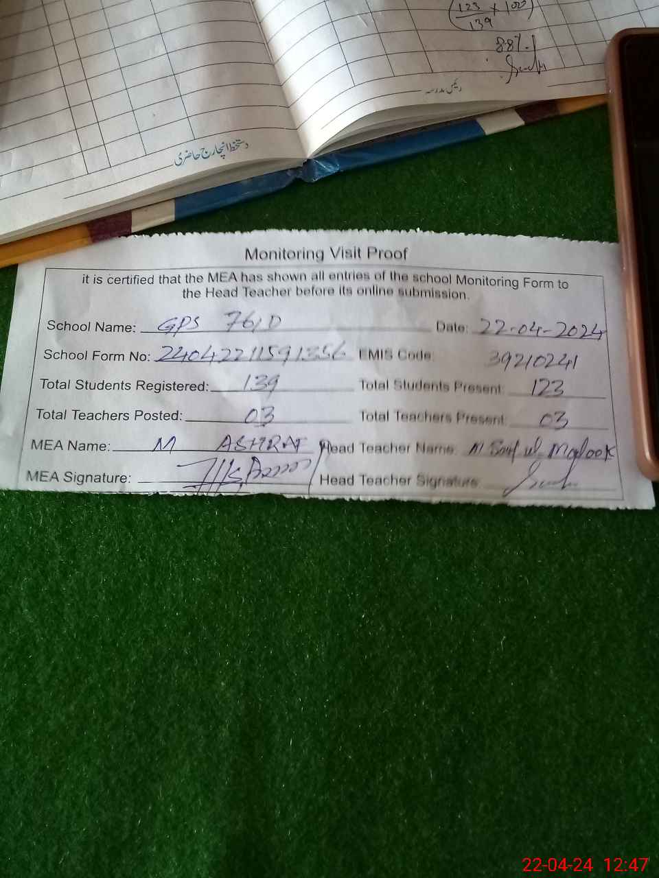 | Attendance Register | Head Teacher | MEA with School | Visit Proof |